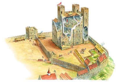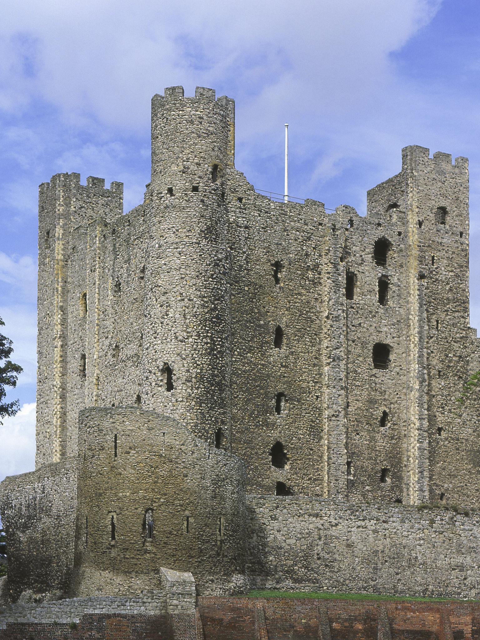 로체스터 성은 노르만 시대 성의 특징인 거대한 석조 성벽을 가지고 있다.